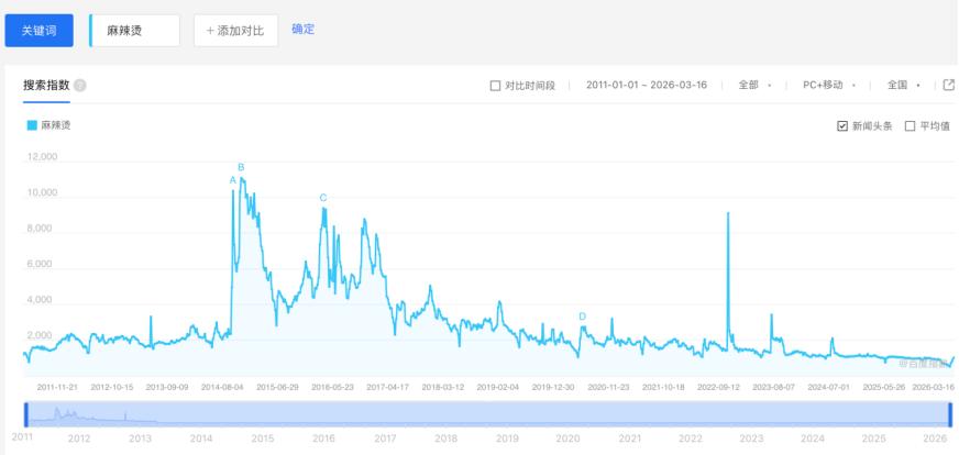 通过百度指数可以看到,近几年“麻辣烫”的搜索热度,显著低于此前。近15年时间里,“麻辣烫”的热度经历了高涨到骤冷,热度最高时2014年7月达到11081,2014年到2018年期间,始终保持着较高热度。2020年起,“麻辣烫”热度出现明显降温,此后热度一路下滑,2026年起热度始终保持在1000以下。