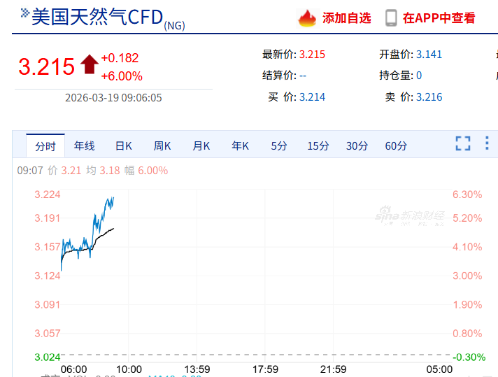 3月19日,美国天然气期货飙升,截至发稿涨6%,现报3.215美元/百万英热。