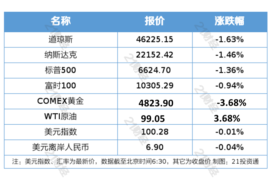 1、美国三大股指全线收跌,道指跌1.63%报46225.15点,创年内新低,标普500指数跌1.36%报6624.7点,纳指跌1.46%报22152.42点。麦当劳、宝洁公司跌超3%,领跌道指。万得美国科技七巨头指数跌1.47%,亚马逊跌超2%。纳斯达克中国金龙指数跌2.06%,微博跌超10%,腾讯音乐跌逾9%。
