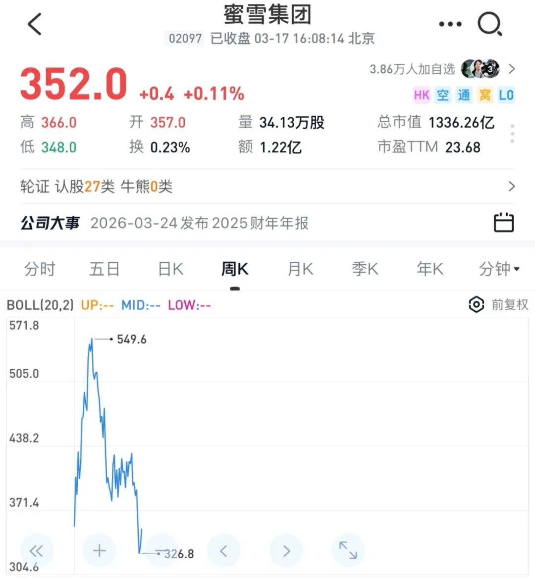 但巅峰过后拐点如期而至,曾经一路高歌的股价在触顶后开始震荡下滑。到2026年3月,股价较高点已近乎腰斩,市值蒸发超千亿港元。截至发稿日,蜜雪冰城报352港元/股,涨幅0.11%,总市值1336亿港元。