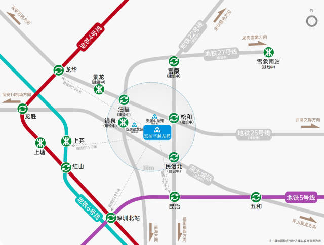 交通配套也在加速升级。华越龙苑周边现已分布有4号线龙华站和6号线上芬站。在建中的地铁 27 号线、25号线、22号线的油福站、银泉站、松和站(原油松站)和民治北站,散布于项目四角,均被列入深圳发改委《2026年重大项目清单》。