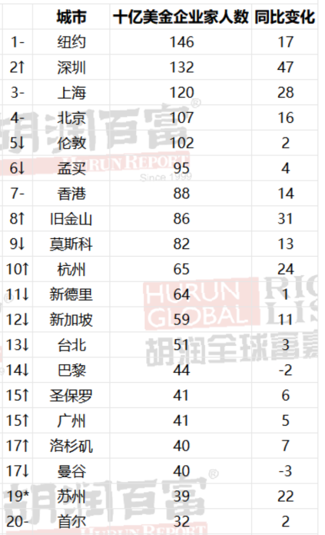 十亿美元企业家居住地城市排行|胡润百富