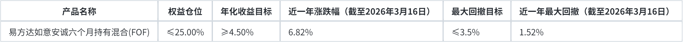 从目标收益风险接近的招行的“安定盈”和建行的“中低波-多资产FOF”来看,安定盈推荐的“易方达如意安诚六个月持有混合 (FOF)”近一年收益率为6.82%,近一年最大回撤为1.52%,达到安定盈设定的相应要求。
