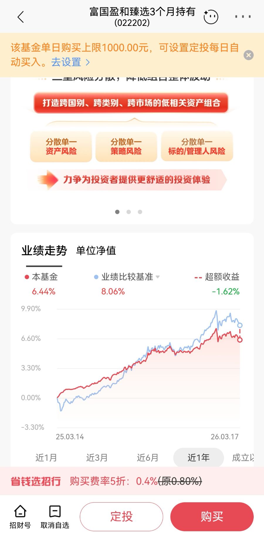 招行TREE长盈计划推荐的基金也不是100%达标,比如“安鑫盈”中推荐的“富国盈和臻选3个月持有期混合(FOF)A”近1年收益率就没有跑赢业绩比较基准,截至3月17日,近1年收益率为6.44%,低于业绩比较基准8.06%。