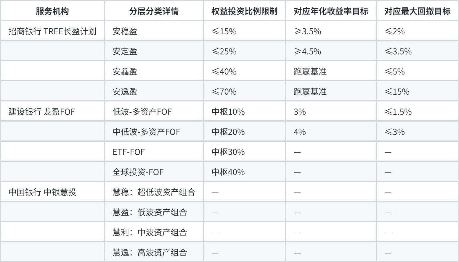 招行TREE长盈计划、建行龙盈FOF、中行中银慧投资产配置服务对比