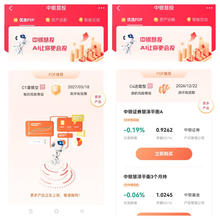 (不同风险承受能力投资者看到的中银慧投页面)