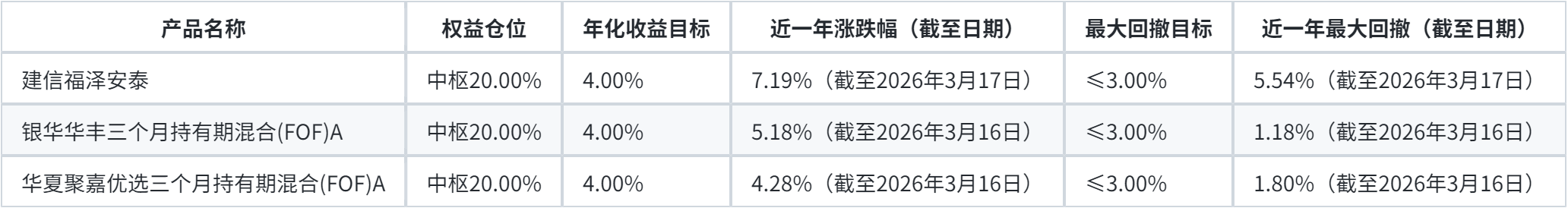 建行龙盈“中低波-多资产FOF”由于服务推出时间短,只能参考包含入池前表现的历史业绩,其中“银华华丰三个月持有期混合(FOF)A”“华夏聚嘉优选三个月持有期混合(FOF)A”近一年表现基本能达到“中低波-多资产FOF”的要求。“建信福泽安泰混合(FOF)A”近1年最大回撤5.54%,则超过了3%的目标,但收益率也相应更高,近1年收益率为7.19%,未来最大回撤能不能控制到目标范围内还有待观察。
