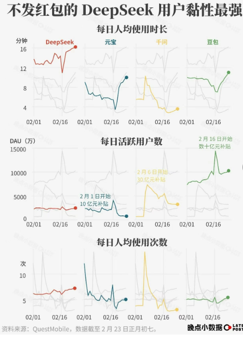 大厂们掀起红包大战,业务四面出击,不断拉长着战线,也在分散着资源,稀释着战略。回头一看,用户留存时间最长,粘性最高的反而是聚焦模型能力提升的DeepSeek。