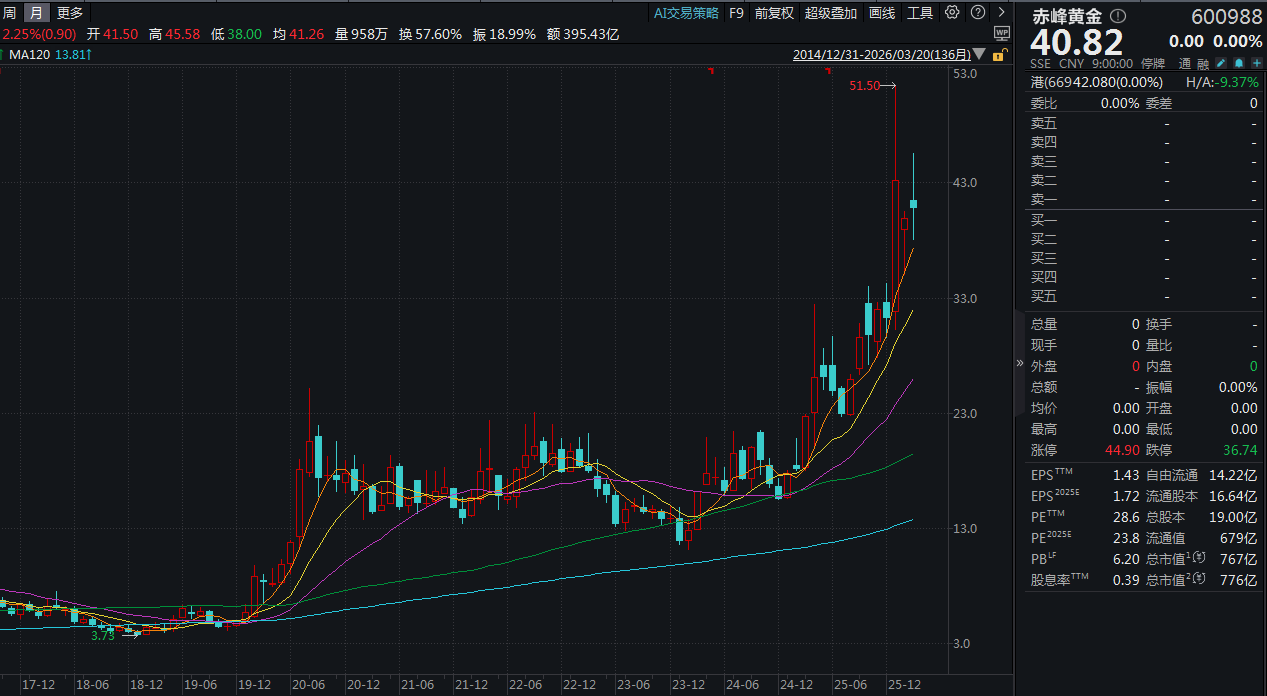 直至2025年,国际金价大涨引发全民关注后,赤峰黄金全年股价才出现了翻倍上涨,并于今年一度冲高至51.5元。
