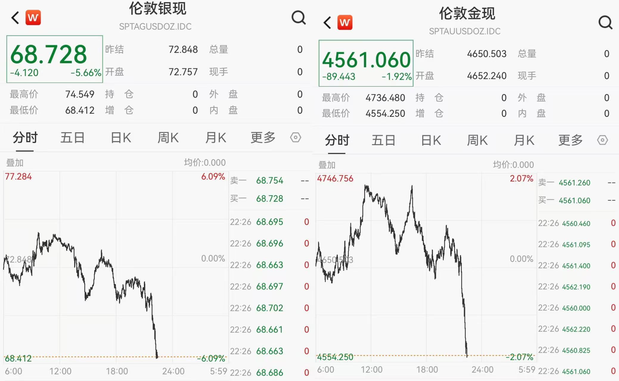 国际贵金属跌幅扩大,现货白银日内跌幅扩大至5.66%,报68.728美元/盎司。现货黄金跌1.92%,报4561.060美元/盎司。
