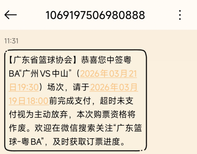 3月19日,2026年广东省城市篮球联赛组委会正式公布揭幕战及首轮比赛购票抽签结果。广大球迷即日起可登录官方指定票务平台“粤BA购票”页面或留意手机短信通知,查询本人抽签状态。
