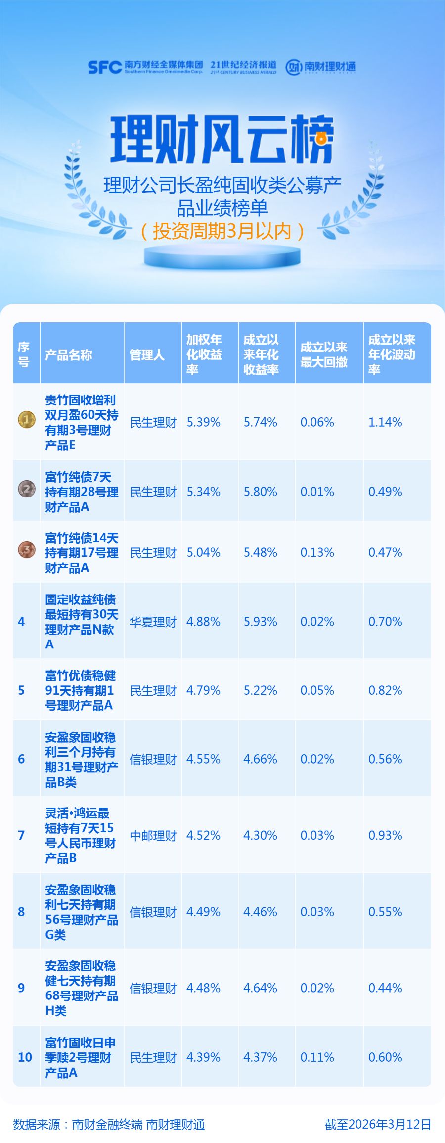 本期榜单统计对象为理财公司发行的成立满1年的公募纯固收产品,投资周期为3月以内期限,同系列同投资周期产品保留一只,加权年化收益率计算方式为“5%×近1月年化收益率+10%×近3月年化收益率+15%×近6月年化收益率+30%×近1年年化收益率+40%×成立以来年化收益率”,排名依据为加权年化收益率,数据计算截止时间为2026年3月12日。