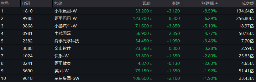 权重科技股普跌,小米跌超8%,阿里巴巴跌超6%,百度、美团跌近2%。