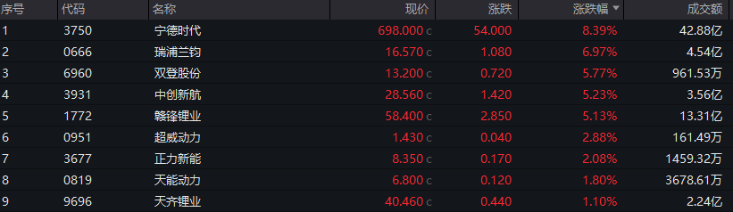 锂电池股走强,宁德时代涨超8%,中创新航、赣锋锂业涨超5%。