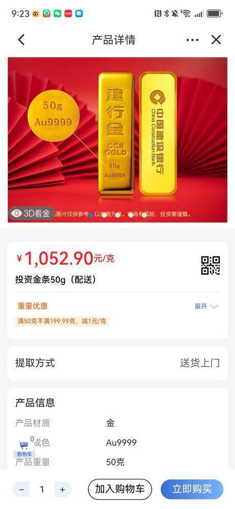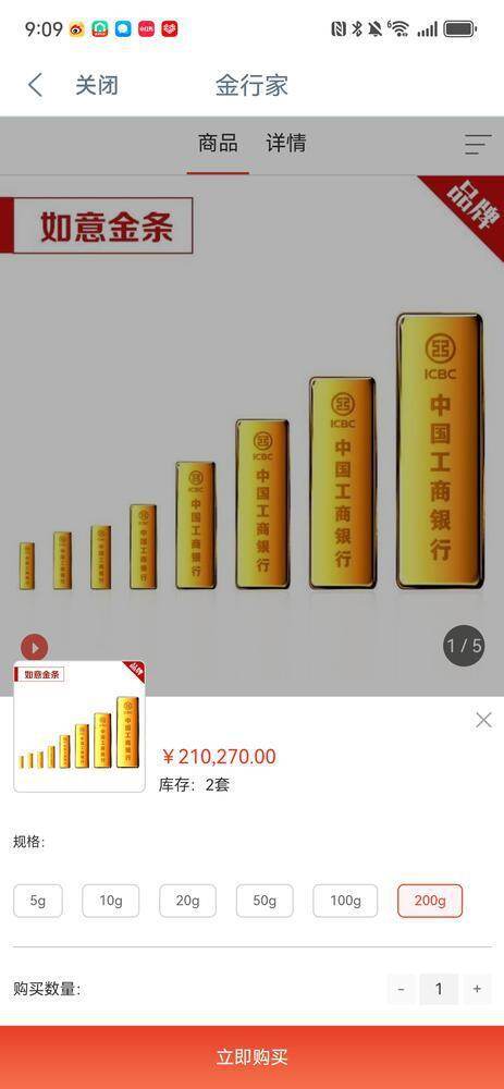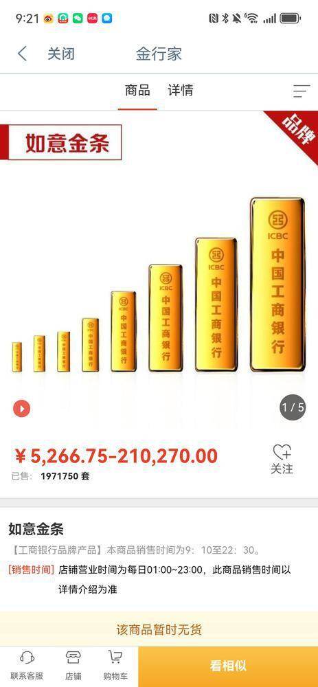 羊城晚报全媒体记者第一时间登录几家国有银行APP发现,小克重的金条确实“一金难求”,以建行APP为例,目前仍然能够购买的最小克重位50g,实时价格位1052.9元/g。而工行在记者第一次打开时仍然显示从5g到200g的金条仍然可以用少量可以购买,其中200g的金条总价约为21万多,还有两套可以选购,但是不到半小时后,其APP上显示已经全部售罄,整个实物黄金页面显示“该商品暂时无货”。