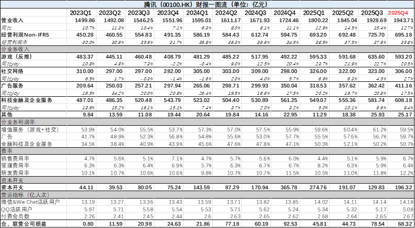 3月17日尾盘,腾讯发布了2025年四季度财报,营业收入录得1943.7亿元,同比增长12.7%,略高于市场一致性预期,净利润为582.6亿元,同比增长14%,经营利润率35.8%,与预期基本一致。(下图为腾讯一图流,数据均来自于财报,单位亿元,锦缎研究院整理)