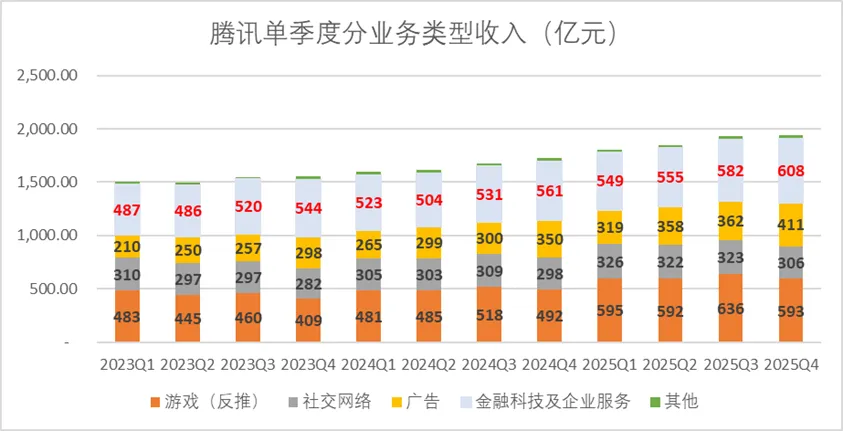 增值服务业务板块的另外一面,就是涵盖视频号和内容平台会员的社交网络业务,2025年四季度腾讯社交网络业务收入306亿元,同比增速仅有2.7%,连续三个季度增速下滑,显然这与年初市场对今年视频号商业化提速的预期不符。