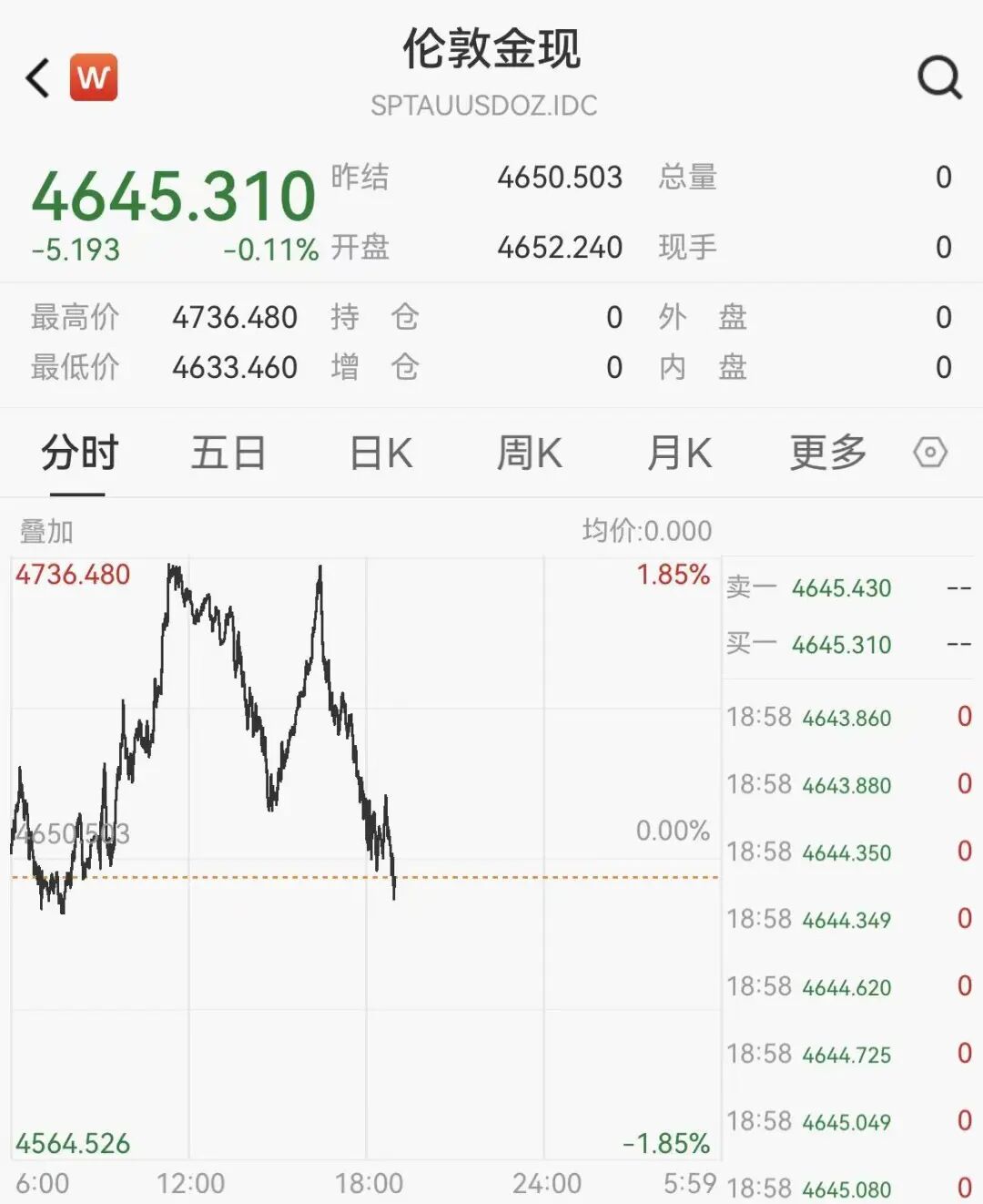 现货黄金由涨转跌,最新报4645美元/盎司。现货白银日内跌幅超1.5%,最新报71美元/盎司。