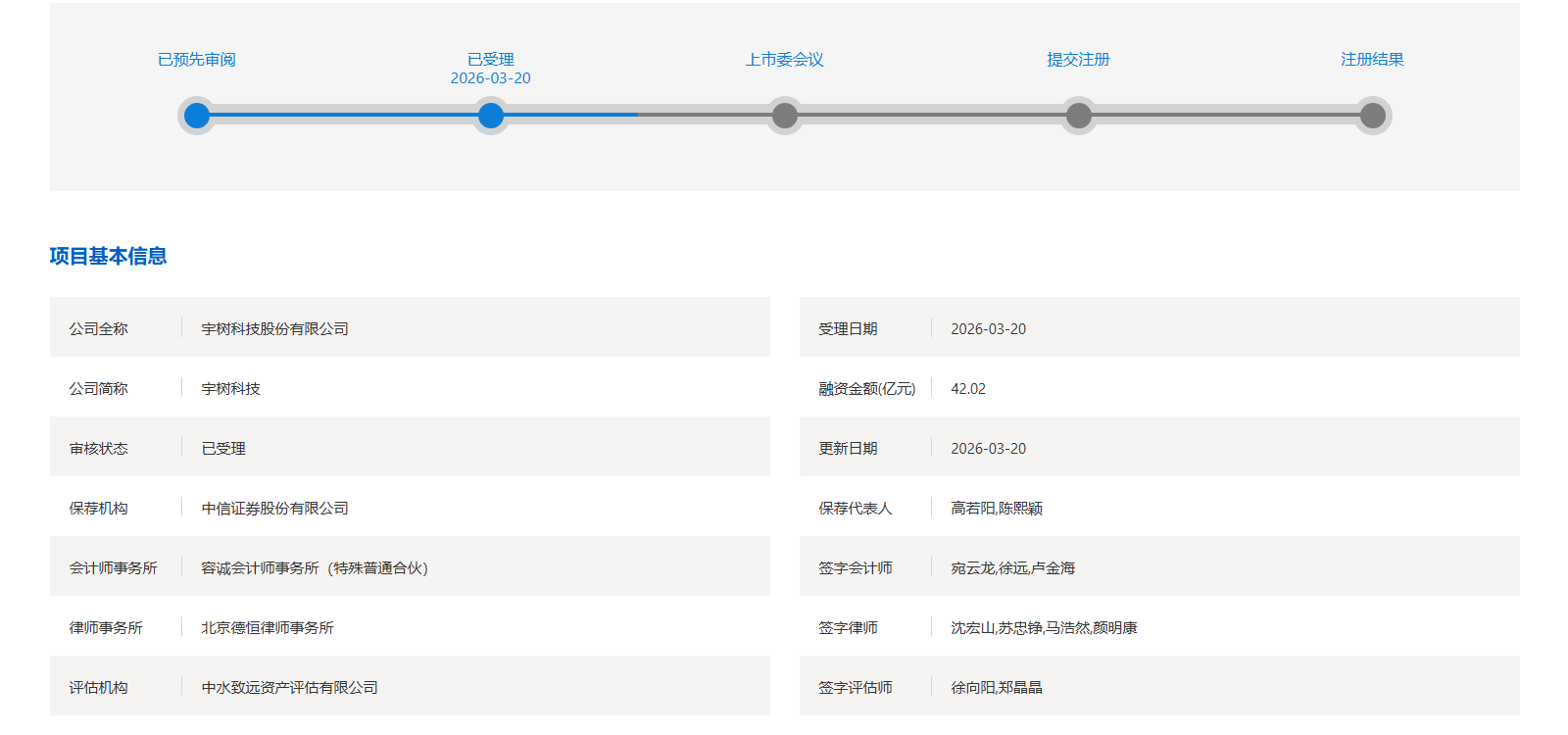 宇树科技冲刺A股人形机器人第一股。3月20日,上交所官网信息显示,上交所受理宇树科技股份有限公司科创板IPO申请,拟融资金额42.02亿元。