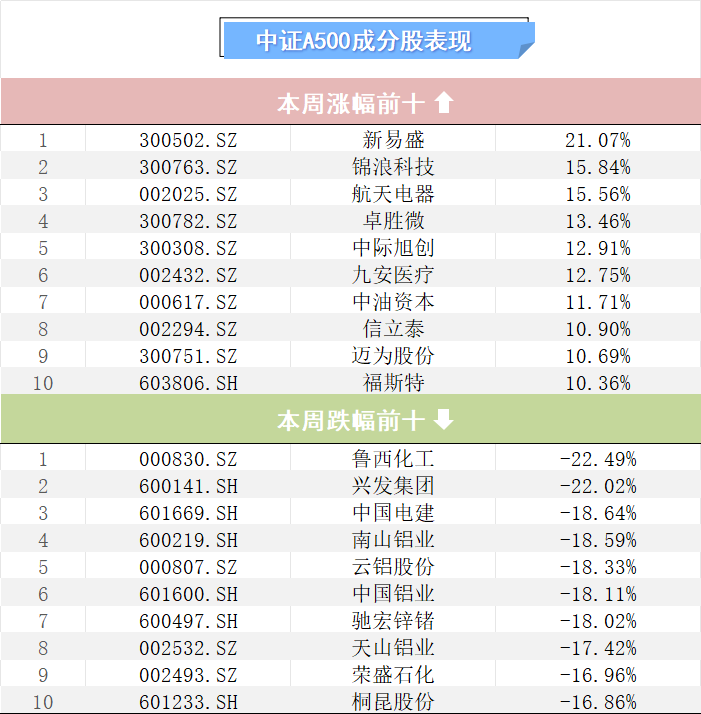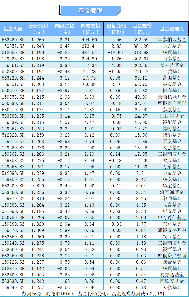 本周中证A500指数下跌3.18%,截至3月20日收盘,报5659.05点。本周日均平均成交额为8237.75亿元,单日成交额环比下降9.45%。