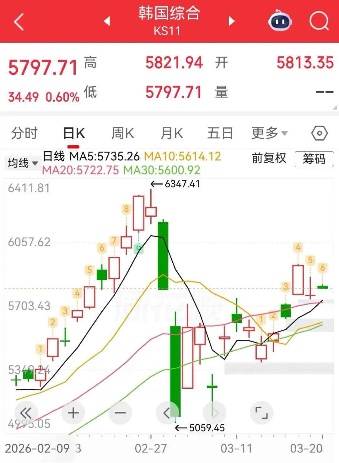 3月20日 , 韩国股市高开, 韩国KOSPI指数涨0.9%。 日本股市因假日休市。