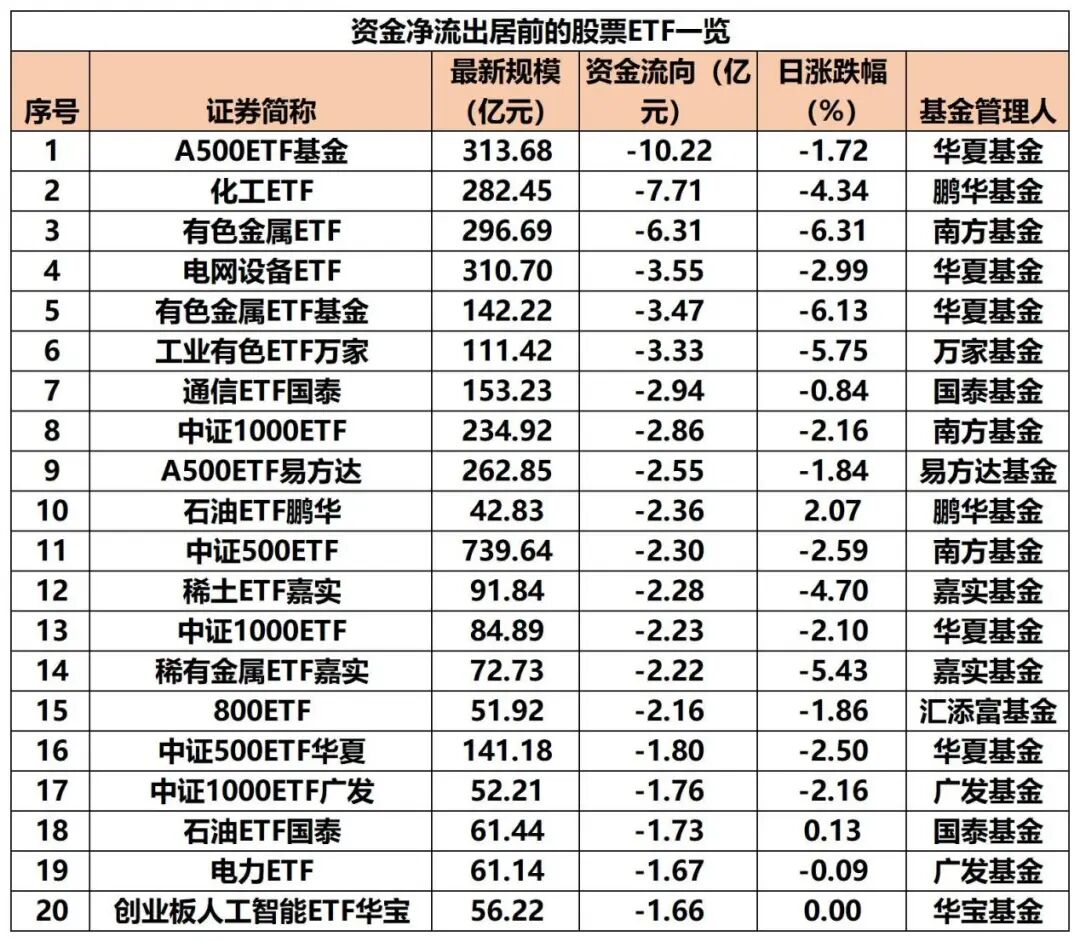 从单日资金净流出排行看,A500ETF基金、中证1000ETF等成为“失血”大户,化工ETF、有色金属ETF、电网设备ETF、通信ETF 等热门主题ETF资金净流出居前。