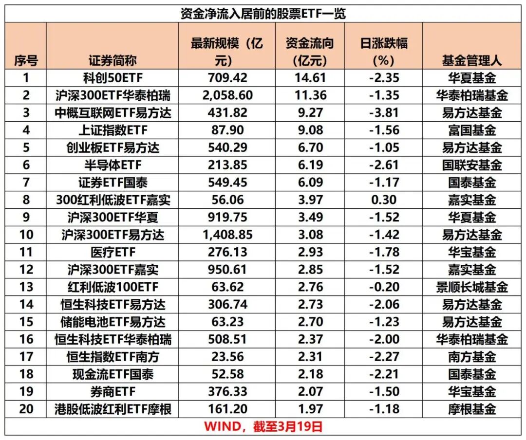 3月19日,A股震荡调整,4000点失而复得,石油、煤炭等轮番演绎。全市场股票ETF资金净流入超60亿元,其中, 科创50ETF、沪深300ETF、上证指数ETF、创业板ETF等宽基ETF成为“吸金”主力, 化工ETF、有色金属ETF、电网设备ETF、通信ETF 等热门主题ETF资金净流出居前。