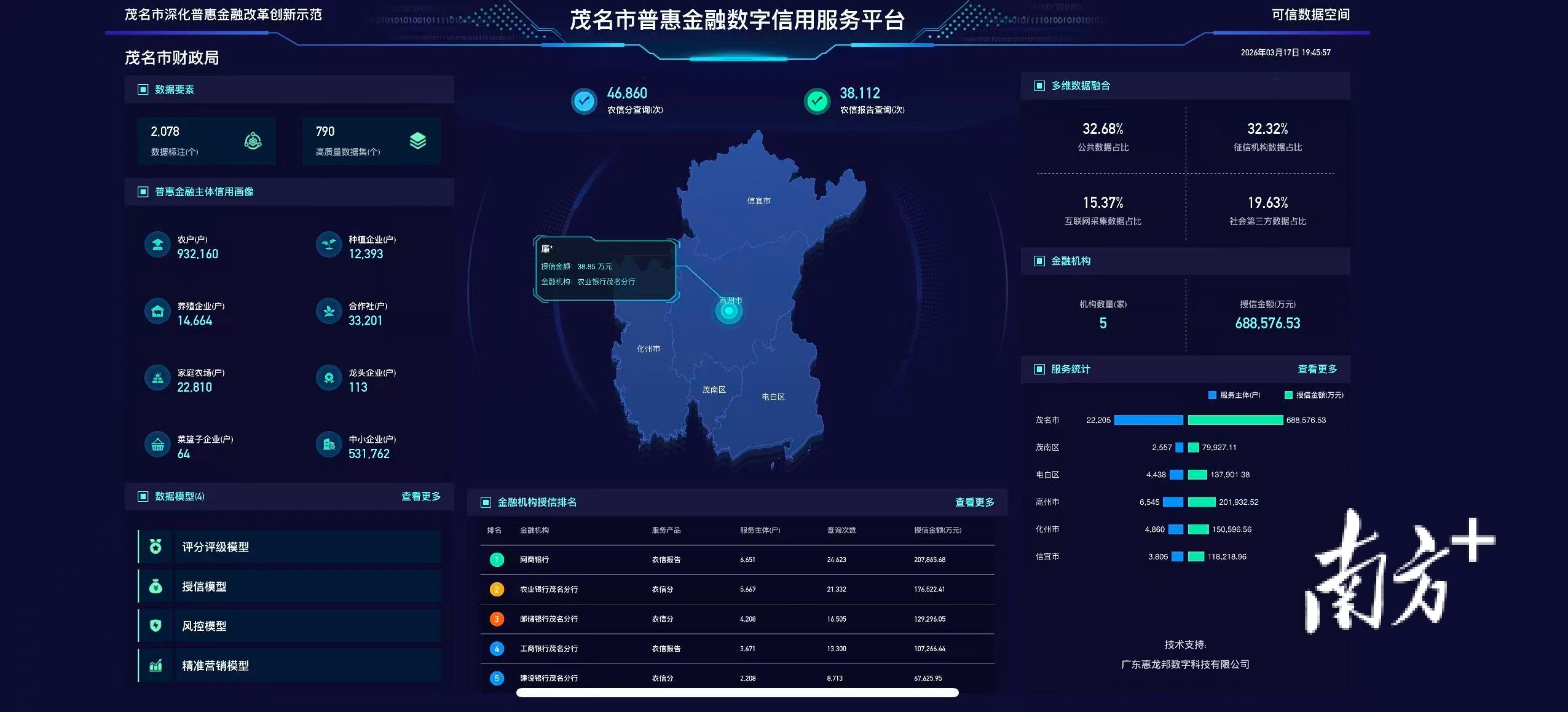这一切是如何实现的?在茂名市财政局,我们见到了这场变革的“总控台”——一块大屏上,数字不停跳动:农信分查询46万次、报告查询38万份、授信金额68.8亿元……