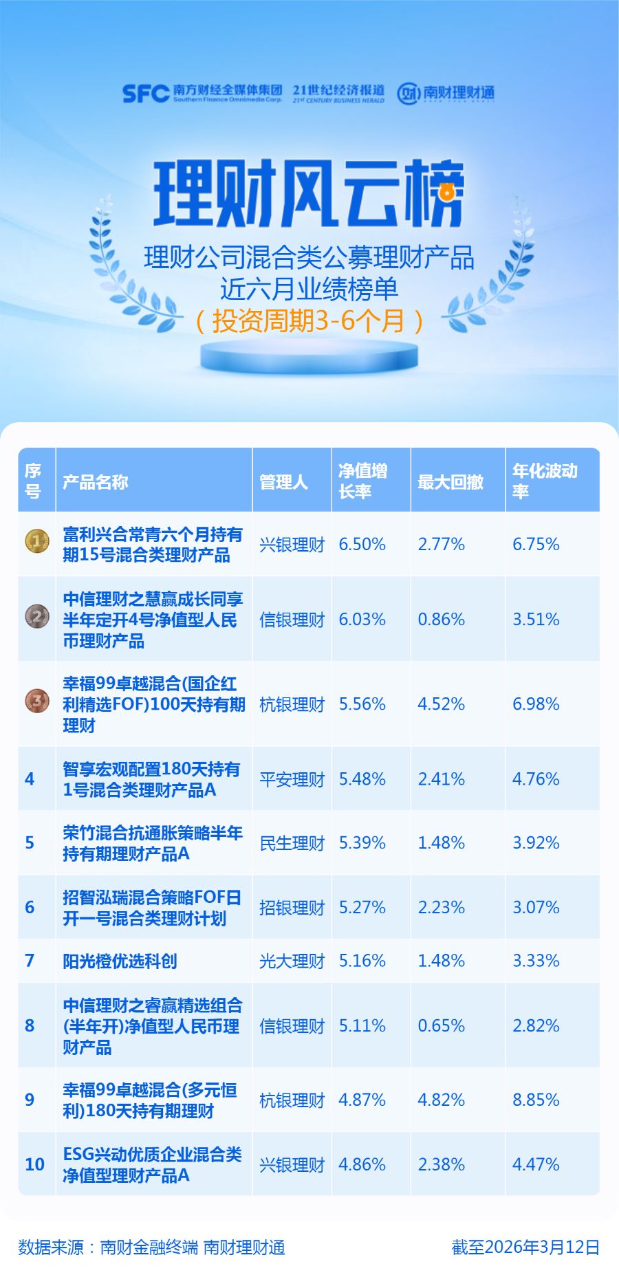产品统计范围为理财公司投资周期为3—6个月(含)的混合类公募理财,产品统计截止日期为2026年3月12日,统计区间为近六个月。