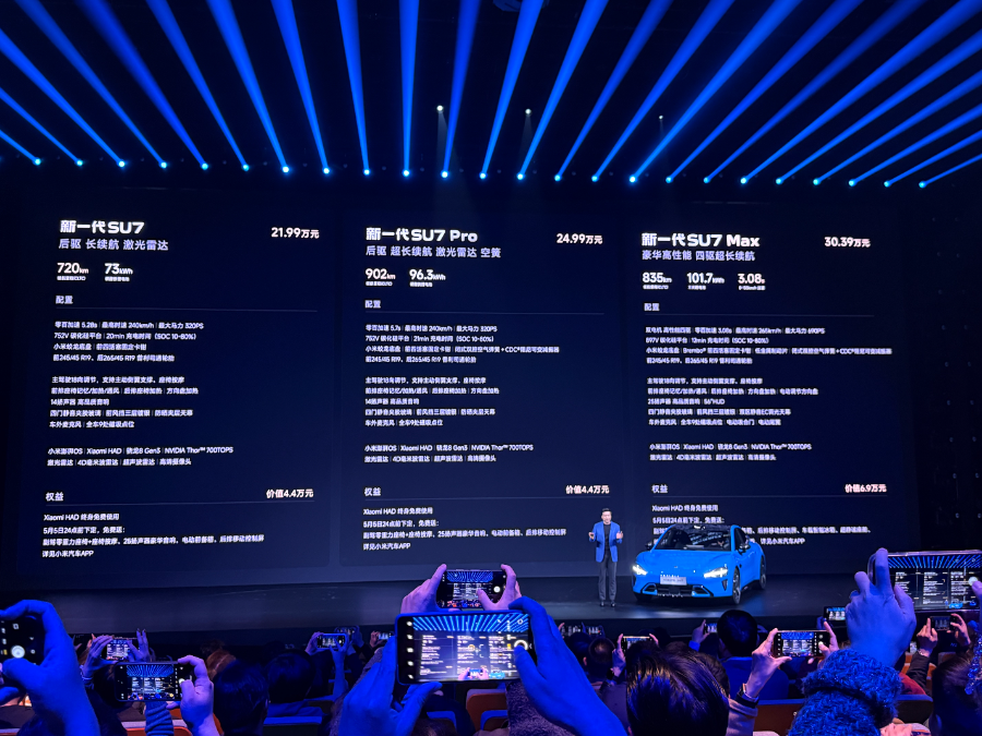3月19日,小米昌平科技园现场,小米新一代SU7正式上市,新车分为标准版、Pro版和Max版,正式售价分别是21.99万元、24.99万元、30.39万元,均比老款提升4000元。