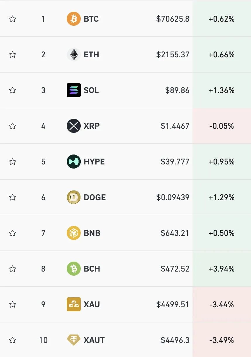 加密货币涨跌不一,比特币报70625美元,日内涨0.62%,以太坊涨0.66%,SOL跌涨1.36%。