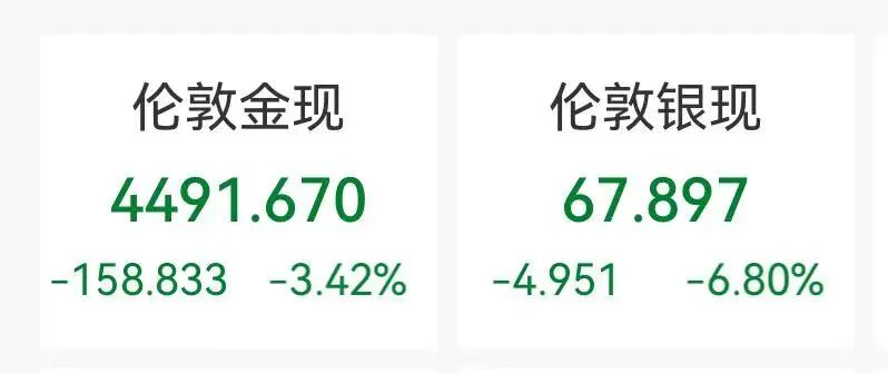 黄金白银价格继续快速下跌,现货黄金失守4500美元,日内跌3.42%,报4491.67美元/盎司;现货白银跌6.8%,报67.89美元/盎司。