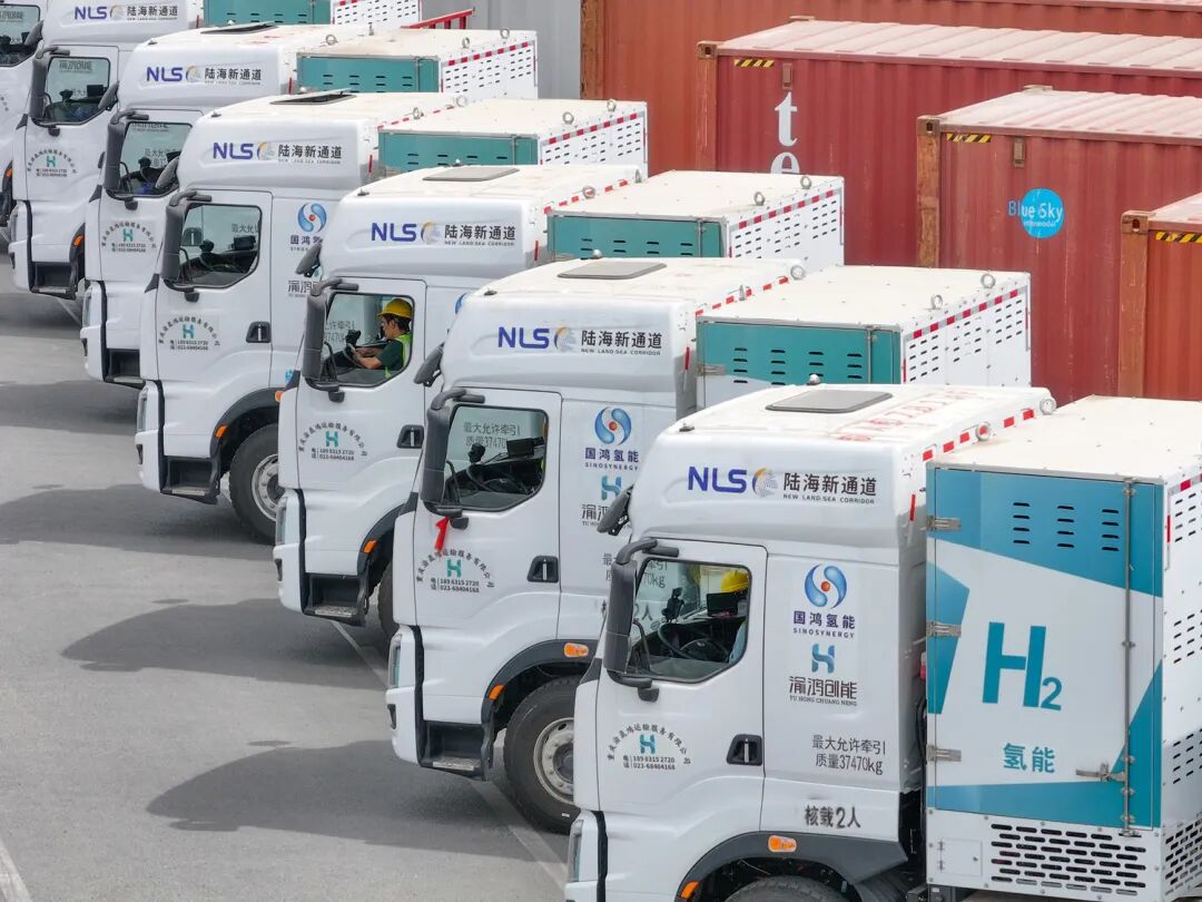 氢能重卡在陆海新通道重庆无水港等候发车 图片来源:新华社