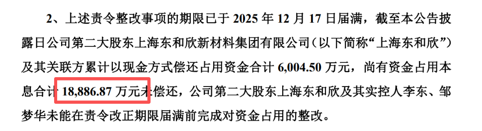 翻看过往公告,*ST奥维早已积重难返,最大的问题在于资金占用。*ST奥维此前公告显示,截至2025年12月17日,公司第二大股东上海东和欣新材料集团有限公司及其关联方仍有资金占用本息合计1.89亿元尚未偿还。