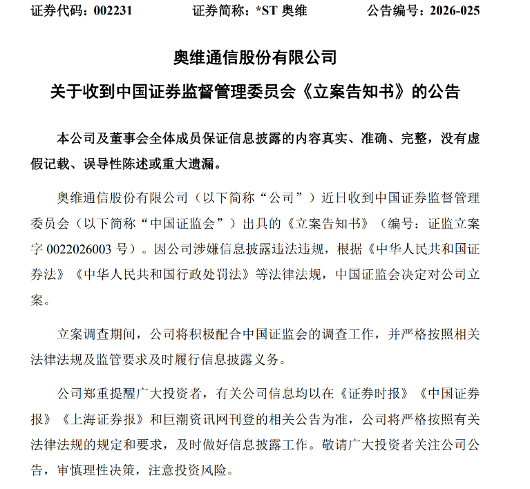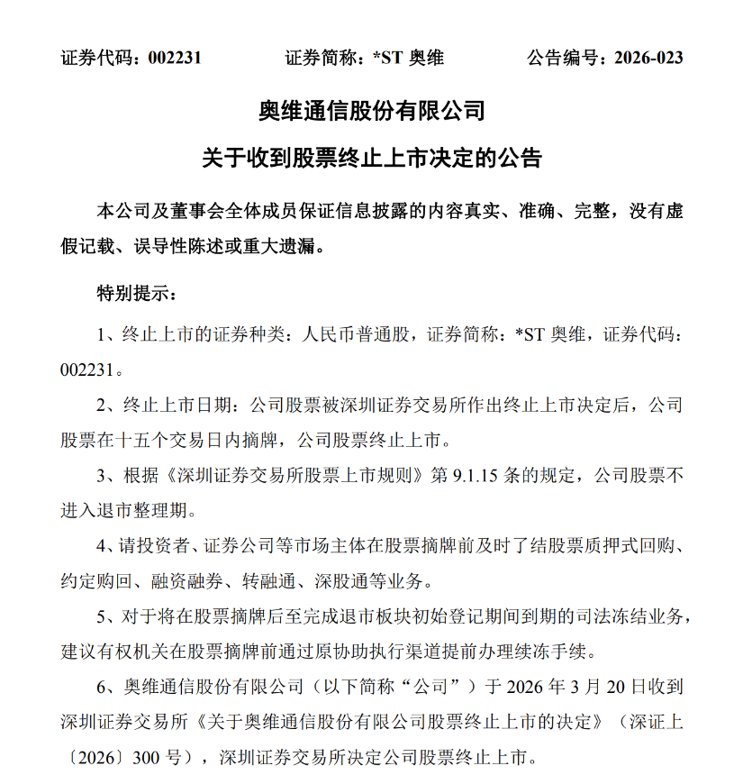 3月20日晚,*ST奥维发布两份公告:一是收到深交所终止上市决定,二是因涉嫌信息披露违规被证监会立案调查。