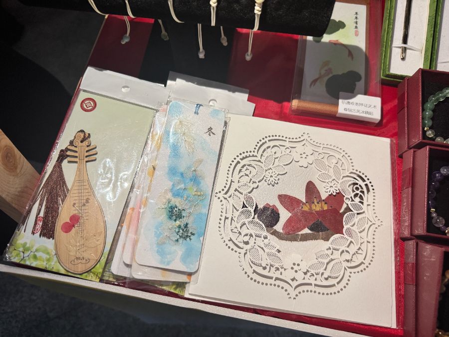 在广州展位上,系列非遗押花手工艺品吸引了一众球迷的关注,其中包括押花手串、项链、明信片等。展位负责人向南方财经记者介绍,“木棉花是广州的市花,押花工艺是广州的非遗,这张明信片用传统技艺把广州的美长久定格下来。”