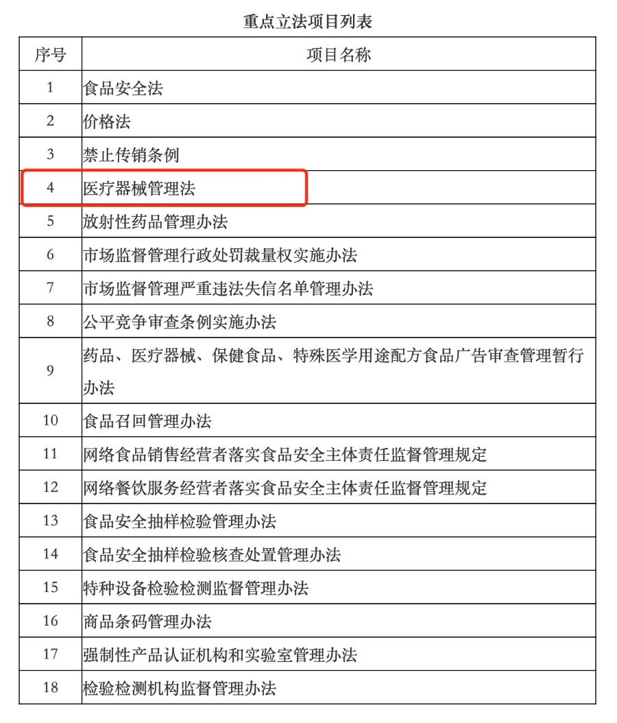 近日,国家市场监管总局部署2026年度重点立法任务,将《医疗器械管理法》纳入其中。