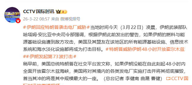当地时间今天(3月22日)凌晨,伊朗武装部队哈塔姆·安比亚中央司令部强调,根据伊朗此前发出的警告,如果伊朗的燃料与能源基础设施遭到敌方攻击,美国及其盟友在该地区的所有能源基础设施、信息技术系统和海水淡化设施都将成为打击目标。