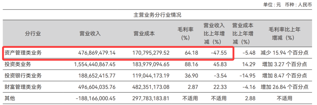 但是其传统优势业务——资管类业务却大幅下滑,仅实现营业收入4.77亿元,同比下降47.55%。