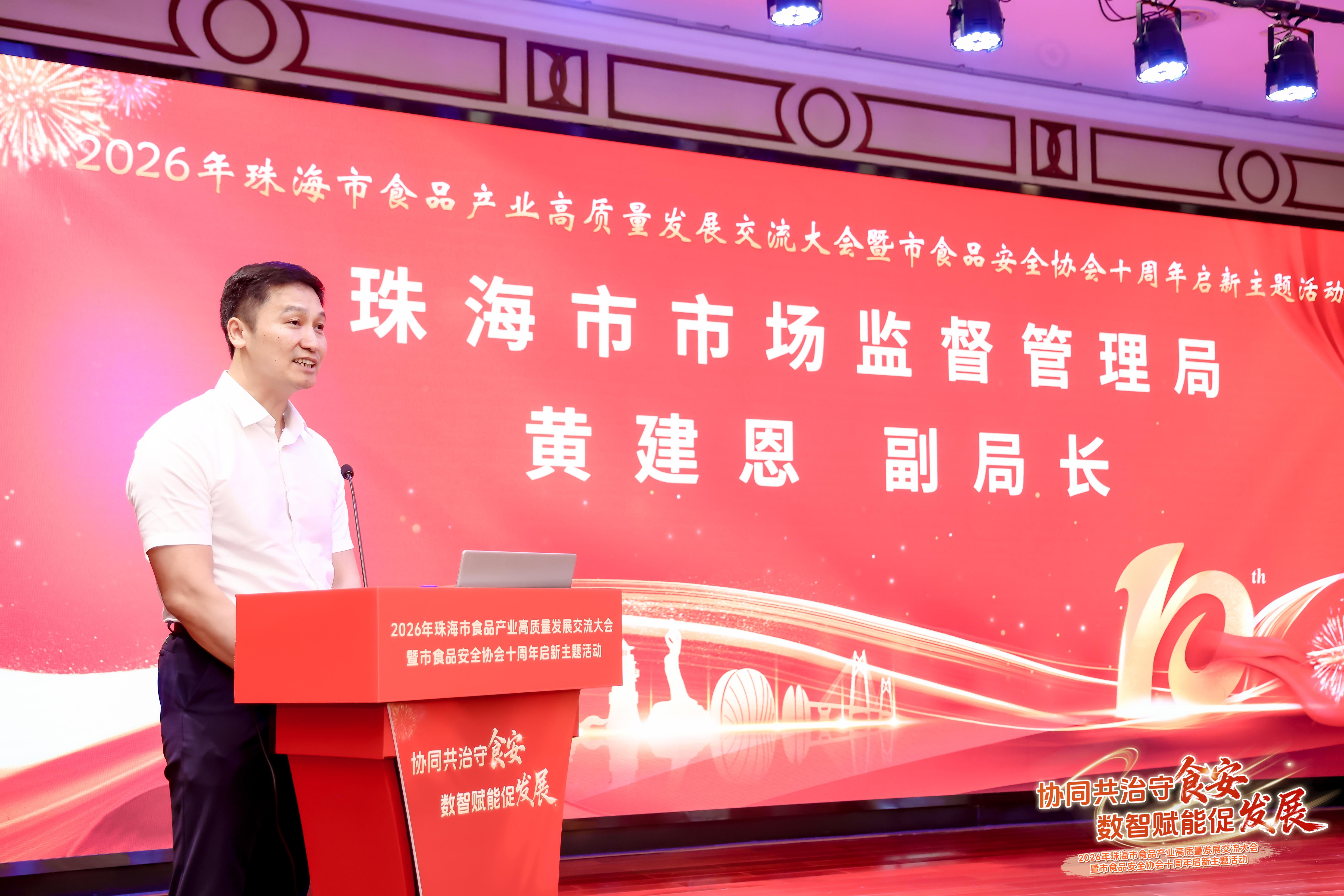 大会伊始,珠海市市场监管局副局长黄建恩发表讲话,对市食品安全协会十年来的工作成效给予高度肯定。他指出,十载深耕中,协会在推动行业自律、严守食品安全底线、引导企业规范发展等方面主动作为,成为政企沟通的坚实桥梁。黄建恩强调,食品安全事关民生福祉,契合国家大食物观要求,寄语企业绷紧安全合规之弦、深耕品质创新,期待协会以十周年为起点,凝聚行业发展合力,推动食品产业向规模化、标准化、品牌化方向稳步迈进,打造“食安珠海”名片。