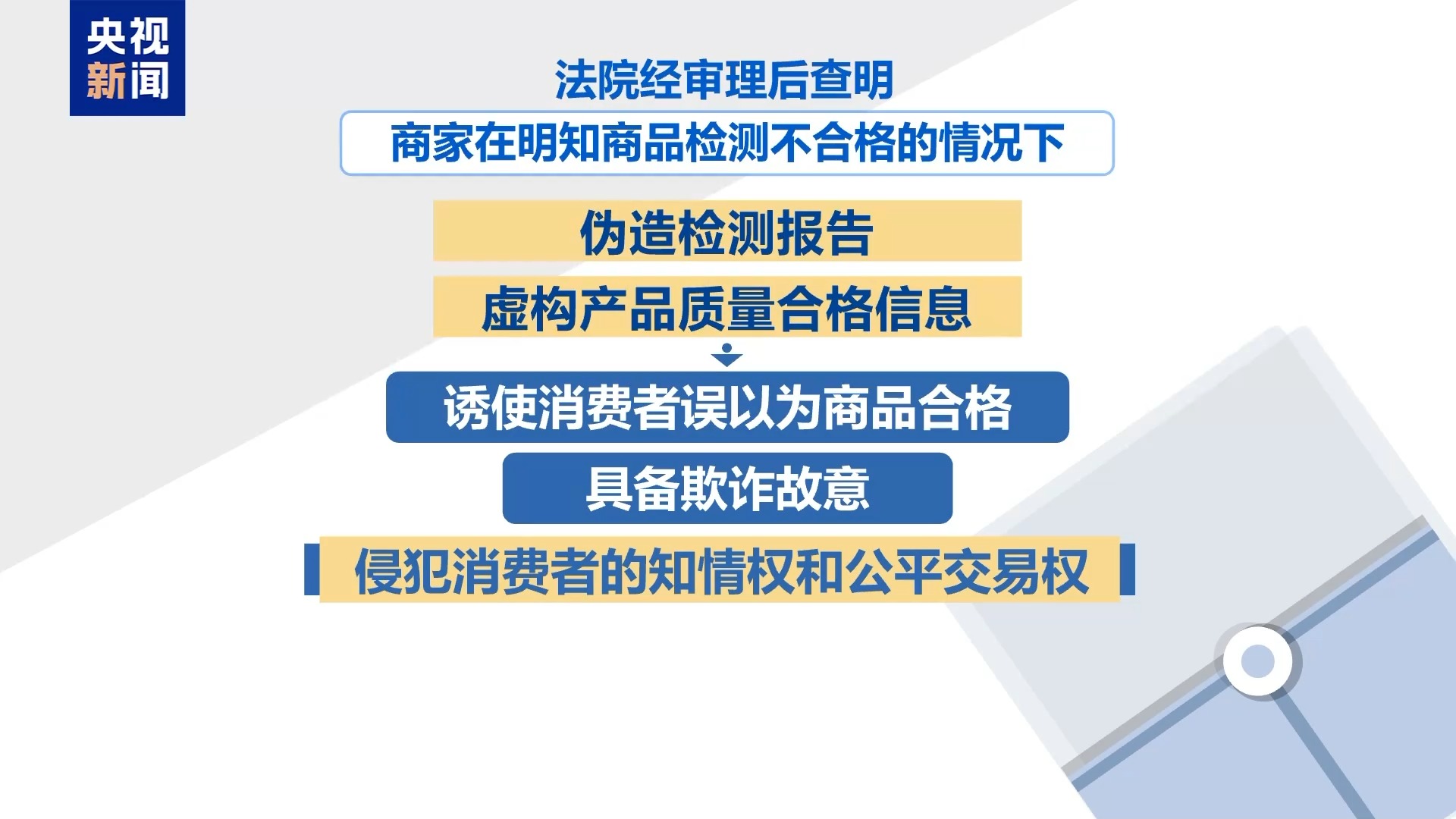 法院经审理后查明,商家在明知商品检测不合格的情况下,伪造检测报告,虚构产品质量合格信息,诱使消费者误以为商品合格,具备欺诈故意,侵犯了消费者的知情权和公平交易权。
