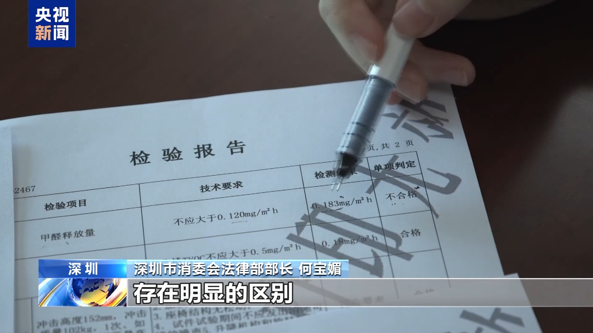 深圳市消委会法律部部长 何宝媚:我通过国家家具产品质量检测中心官网进行查询核验,发现商家所提供的报告结论合格,与官方的登记真实结论不合格,存在明显的区别。