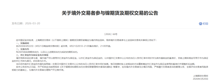 3月20日晚间,上期所发布多条公告,明确镍期货及期权国际化的相关安排,公告涉及上述品种引入境外交易者的公告及相关业务细则等内容。