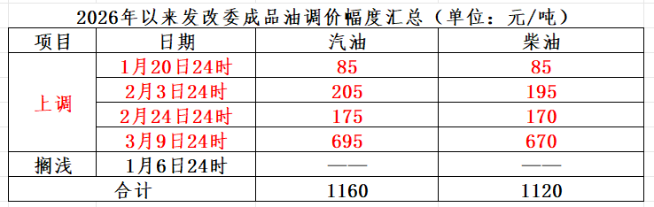 2026年以来,国内成品油零售限价已经历五轮调整窗口,分别为“四涨一搁浅”,国内汽油、柴油价格每吨较2025年底分别上涨1160元、1120元。