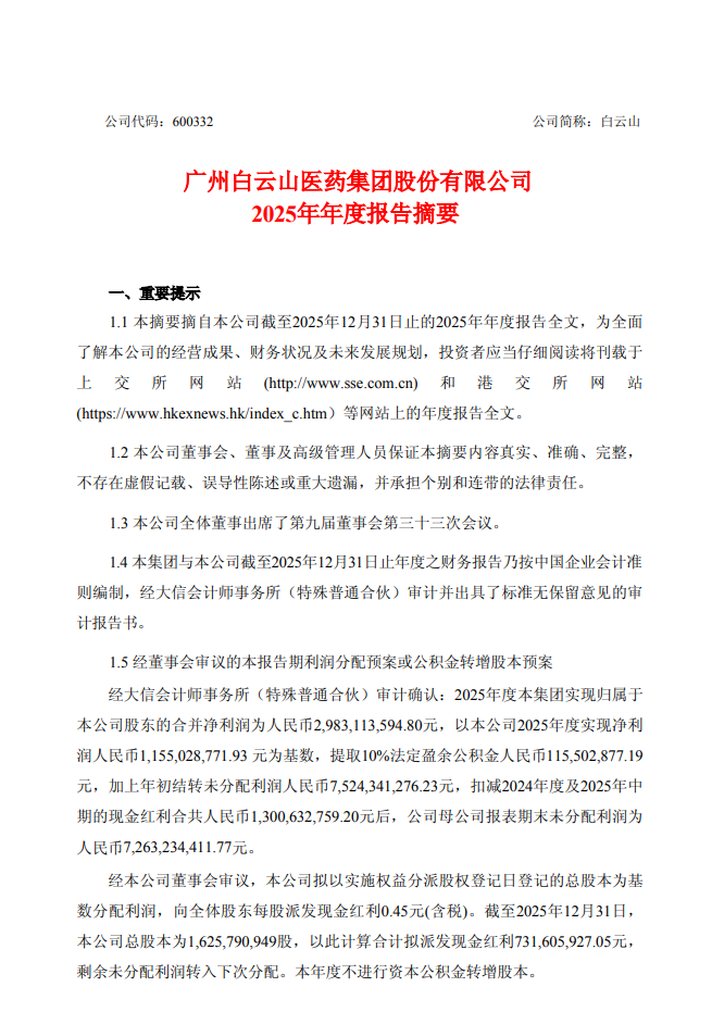 3月20日,广药白云山(600332.)发布2025年年度报告。数据显示,报告期内广药白云山营业收入776.56亿元,同比增长3.55%;利润总额36.90亿元,同比增长2.28%;归母净利润29.83亿元,同比增长5.21%。