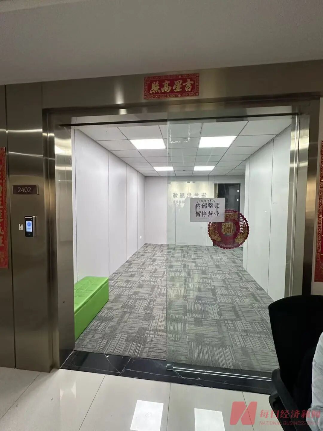 英瑞可苏州总部门口张贴“内部整顿,暂停营业”告示 图片来源:每经记者 许立波 摄