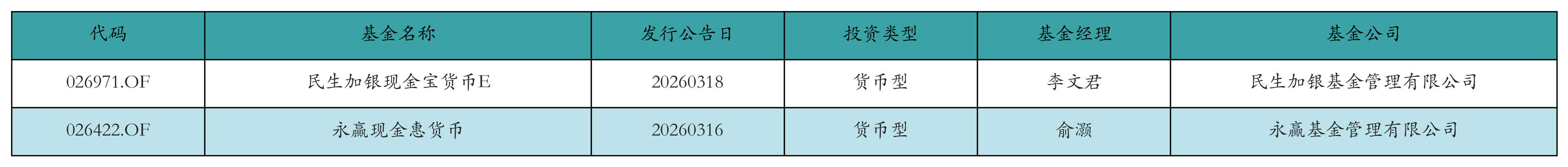 上周有2只新基金发行,分别为:民生加银现金宝货币E、永赢现金惠货币,详情见下表: