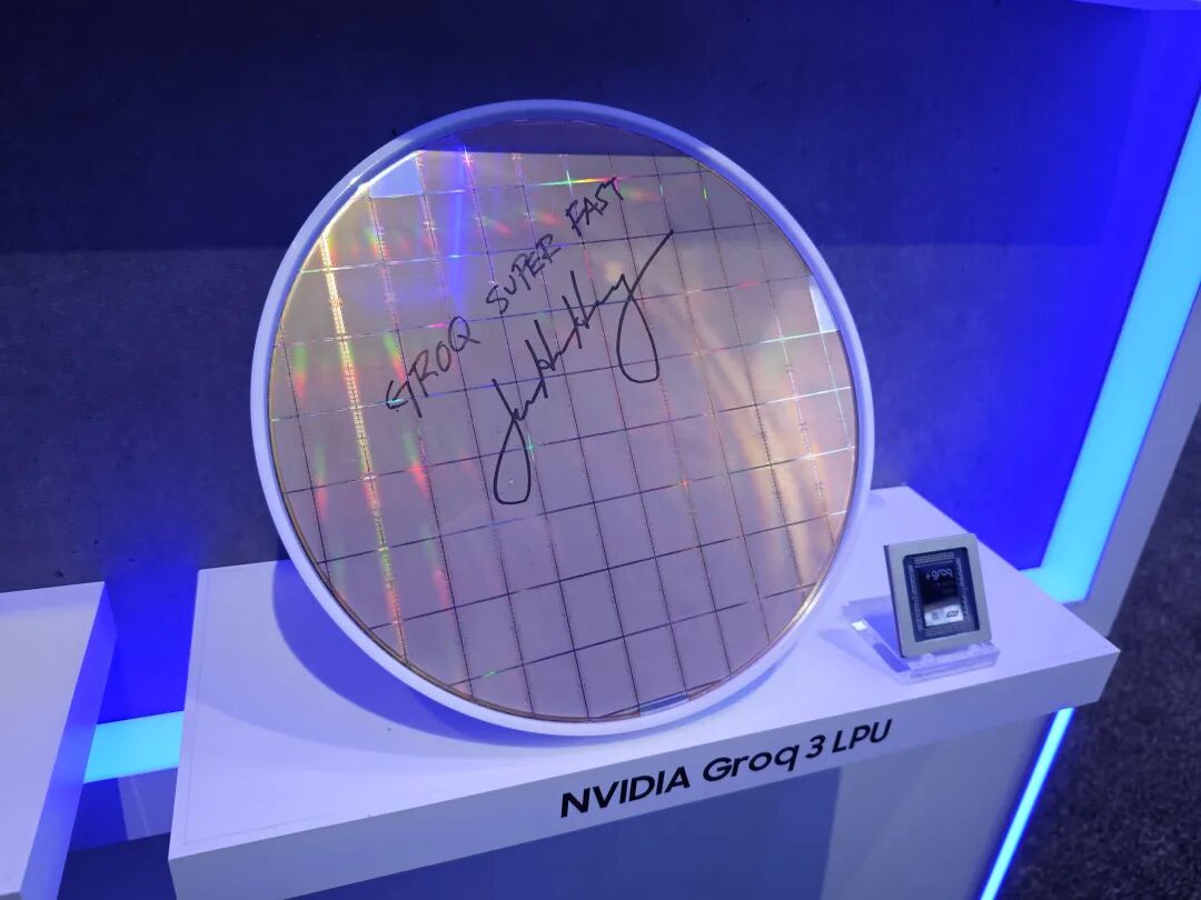 GTC现场展示的NVIDIA Groq 3 LPU,黄仁勋签名并写下“Groq超快”,图片来源:「甲子光年」拍摄