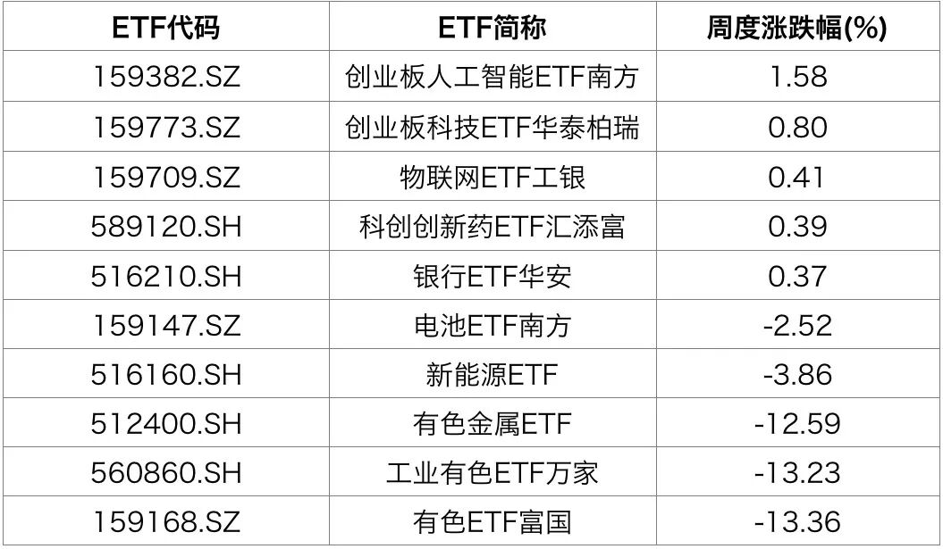 上周市场出现系统性回调,上证指数跌 3.38% ,深成指跌 2.90% 。通信板块,尤其是光模块涨幅靠前,作为含 “ 光 ” 量极高的创业板人工智能 ETF 南方 (159832) ,上周逆市上涨 1.58% ;上周下半周新能源板块也从回调中修复过来,强势反弹。上周五,电池 ETF 南方 (159147) 单日涨幅达 3.50% ,新能源 ETF(516160) 单日涨幅达 2.54%。 上周回调幅度最大的板块是有色金属,单周回调超 10% 。