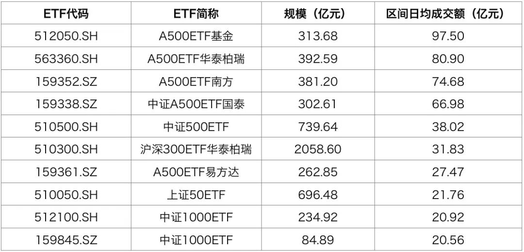 1️⃣上周中盘宽基产品成交活跃, A500ETF 南方 (159352) 、中证 500ETF(510500) 、中证 1000ETF(512100) 流动性领先。
